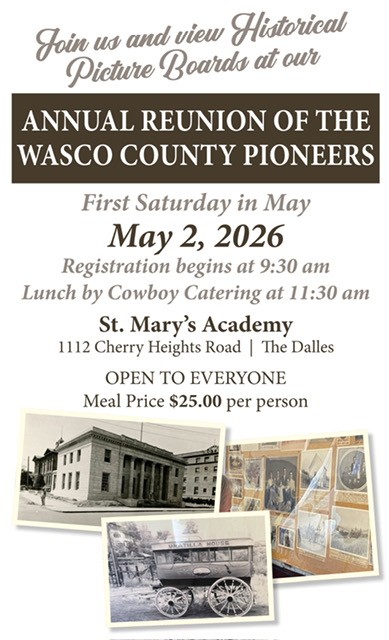 The Wasco County Pioneer Association was founded May 2, 1922. It was to celebrate and remember the thousands of pioneers who flocked to Wasco County via the Oregon Trail to garner their share of the region’s rich natural resources and Federal land grants.